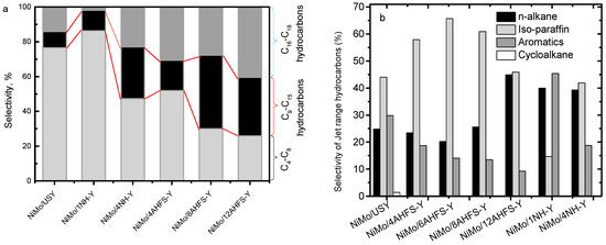 The products distributions were further analysed and summarized in Figure 6a. As for the AHFS-treated catalysts, it could be found that the selectivity of the gasoline-ranged hydrocarbons (C4–C8) decreased significantly compared with the NiMo/USY catalyst (from 76.6% to 52% for NiMo/4AHFS-Y) and further decreased to 30% (NiMo/8AHFS-Y) with the increase of the AHFS concentration. Meanwhile, the selectivity of jet fuel (C9–C15 hydrocarbons) dramatically increased from 9.3% to 42.3% (NiMo/8AHFS-Y). The selectivity of diesel fraction (C16–C18 hydrocarbons) also increased significantly (14.4% to 27.7%). This indicated that the cracking activity over the AHFS-treated catalysts decreased. It was possible that the deep cracking reaction was restrained by the decrease of the acid sites density, especially the Brønsted sited density. It should be noted that the NiMo/8AHFS-Y catalyst showed the suitable activity for selective cracking although the acid site density was very low. This might be attributed to the better acid distribution and mass transfer by the resulted hierarchical structure. While after low-concentration NaOH treatment, the NiMo/1NH-Y catalyst showed high selectivity of C4–C8 hydrocarbons (86.4%) due to the higher density of acid sites. However, after high concentration NaOH treatment, it was interested that although the acid sites density of NiMo/4NH-Y catalyst was much higher than NiMo/USY catalyst, the selectivity to the jet fuel fraction significantly increased to 29.7% with a relative low selectivity of C4–C8 hydrocarbons (47.3%). These results suggested that the selective cracking mainly depended on the location of acid sites, not the acid site density. The acid sites in the mesopore channel had better activity for selective hydroconversion of WCO than in the micropore and on the surface, and dealumination could produce a better hierarchical structure and acid distribution than desilicaton.