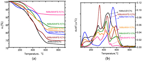 The production of coke was the result of the formation of heavy compounds, which may cover certain acid sites and cause a hindrance to diffusion or block the channels of the catalyst and change the cracking activity [38]. The amount of coke was determined by TG in air. Figure 7 shows the observed mass losses for used catalysts after reaction for 7 h. As shown in Figure 7b, four stages of the mass loss from 30 °C to 230 °C, 230 °C to 330 °C, 330 °C to 520 °C, and 520 °C to 700 °C were observed which corresponded to the loss of adsorbed water, the formed soft coke, hard coke, and graphite, respectively [39]. The mass loss from 230 °C to 700 °C for used NoMo/USY, NiMo/4AHFS-Y, NiMo/6AHFS-Y, NiMo/8AHFS-Y, NiMo/1NH-Y, and NiMo/4NH-Y catalysts were 22.78%, 22.52%, 15.62%, 7.91% ,16.23%, and 15.34%, respectively. The total coke of used NiMo/AHFS-Y catalysts decreased with the increase in AHFS treatment severity. There were two likely reasons: Firstly, the number of acid sites, especially the strong acid sites, were mainly responsible for the coke deposition [40]. From Table 2, the AHFS-Y zeolites had a drastically lower acid amount than the corresponding USY zeolites and the acid amount decreased with the increase in AHFS treatment severity. Secondly, the macromolecules would form in the free cavities of USY, and hard coke essentially located in the zeolite cavities and was difficult to diffuse out from the channel. From Table 3, the volume and the size of mesopores of AHFS treated USY increased, which would reduce the chance of the coke formation [41]. Although the number of strong acid sites increased for the alkaline treated USY, the volume of mesopores also increased, which reduced the coke.