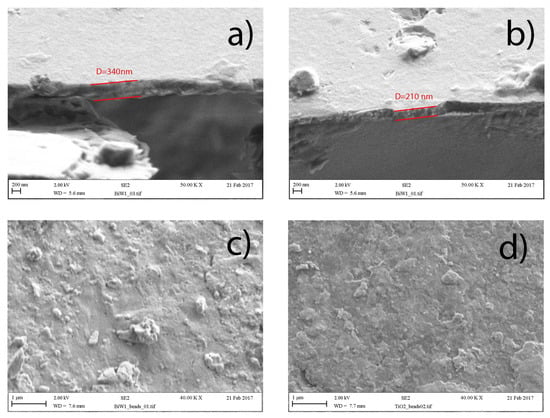 Cross-section SEM images of the coatings (a) Bi0, (b) BiW1 and top view SEM images of the coatings (c) BiW2, and (d) TiO2.