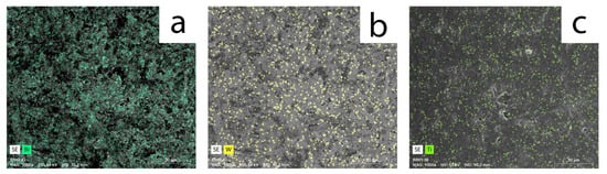 Results of elemental mapping for selected coatings: (a) sample BiW2 bismuth; (b) sample BiW2 tungsten; and (c) sample TiO2 titanium.