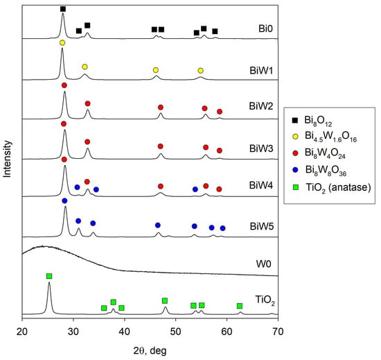 The XRD results after thermal treatment of the samples are presented in the Figure 3. As evidenced from the XRD patterns, all samples, except W0, were crystalline with peaks readily observable on the patterns. Peaks seen on the pattern of sample Bi0 correspond to the bismuth oxide pattern; Bi8O12 (JCPDS 96-901-2328). As tungsten was introduced to the coatings, the peaks found on the XRD patterns of co-sputtered samples can be attributed to various bismuth tungstate phases. Thus, all peaks on the pattern of BiW1 sample were found to belong to tetragonal russelite, with the formula Bi4.5W1.6O16 (JCPDS 96-101-1216). Increasing the tungsten to bismuth ratio in the coatings resulted in changes in the composition and structure of the coatings—all peaks for both samples, BiW2 and BiW3, can be assigned to Bi8W4O24 orthorhombic russelite (JCPDS 96-901-1800). In the XRD pattern of sample BiW4 Bi8W4O24 peaks co-exist with the peaks attributed to the Bi8W8O36 structure (JCPDS 96-721-3034), while all of the peaks of the sample BiW5 can be attributed to the latter phase. It should be noted that, despite increasing tungsten content, none of the peaks in the patterns of the co-deposited films could be attributed to tungsten oxide phases. The amorphous structure of sample W0 implies that annealing at 673 K was not sufficient to reach the crystallization point of tungsten oxide. Therefore, even tungsten-rich samples exhibited no peaks for tungsten oxides. A sample of titanium dioxide after annealing at 673 K exhibited only the peaks that could be attributed to the anatase titania phase with major peaks found at 2θ angles of 25.3°, 37.8°, 48.0°, 55.0°, and 62.6° (JCPDS 96-900-8215).