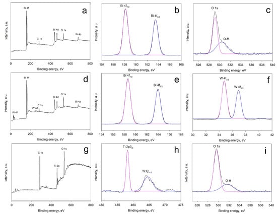 Surface composition and chemical states of the elements were studied with X-ray photoelectron spectroscopy (XPS). XPS estimation of bismuth to tungsten ratios was consistent with EDX data obtained earlier. As XPS has a shallow detection depth (a few atomic layers) compared to EDX, it can be suggested that the distribution of the elements was consistent through the thickness of the coatings. Selected XPS results are presented in Figure 4. Thus, survey spectra of samples Bi0, BiW1, and TiO2 are given in the Figure 4a,d,g, respectively. The presence of a carbon peak (C 1s peak) observed at 284.8 eV on all survey spectra is typically explained by adventitious carbon contamination; the binding energies were referenced to the adventitious carbon peak. On high resolution spectra of the samples Bi 4f peaks appeared at ca. 158.3 eV and ca. 163.6 eV (Figure 4b,e); W 4f peaks were found at ca. 34.8 and ca. 37 eV (Figure 4f). It should be noted here that no significant shifts were observed in the positions of Bi 4f and W 4f peaks for all samples of the Bi/W array. Figure 4c,i show high-resolution spectra for O 1s binding energies, for samples Bi0 and TiO2, respectively—two peaks can be clearly seen at ca. 529.5 and ca. 531.3 eV; these are typically attributed to metal oxide bonds and organic C–O bonds, respectively. On the high-resolution spectrum of Ti 2p (Figure 4h), the peak positioned at ca. 458.3 eV corresponds to Ti 2p3/2, while the peak at ca. 464.1 eV can be assigned to Ti 2p1/2. The positions of the all the peaks observed were in good agreement with the data typically reported in the literature [28,29].