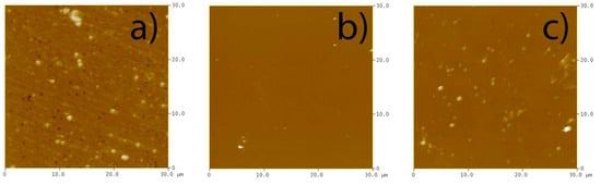 AFM images of selected coatings: (a) Bi0; (b) BiW1; and (c) TiO2.