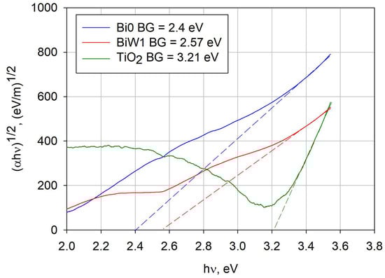 The classical Tauc plot method was used for estimating the optical band gaps of the deposited coatings, as described earlier in the Experimental section, assuming indirect allowed transitions [15,30]. Examples of the band gap calculation for selected coatings (Bi0, BiW1, and TiO2) are shown in Figure 6. The values of the estimated band gaps are given in Table 2. It is evident from the data given in this table that the variation of the bismuth/tungsten content had a great effect on the values of the band gap. Thus, the band gap of the bismuth oxide coating, Bi0, was only 2.4 eV; introduction of tungsten to the coatings resulted in an immediate band gap broadening to a value of 2.57 eV (coating BiW1). As the content of tungsten relative to the content of bismuth increased, further band gap broadening was observed. The band gap of tungsten oxide (sample W0) was estimated as 2.97 eV. Therefore, it is obvious from the data that increasing the content of tungsten over bismuth resulted in a “blue” shift of the band gap towards the UV range. The band gap of the titanium dioxide sample was considerably higher, compared to the values obtained for the bismuth/tungsten coatings—3.2 eV. The band gap data are generally in good agreement with the literature information, where the value of anatase titania is typically reported to be around 3.2 eV, and the band gaps of bismuth tungstate range typically from 2.5–2.8 eV, depending on the phase and deposition method [14,15,30].