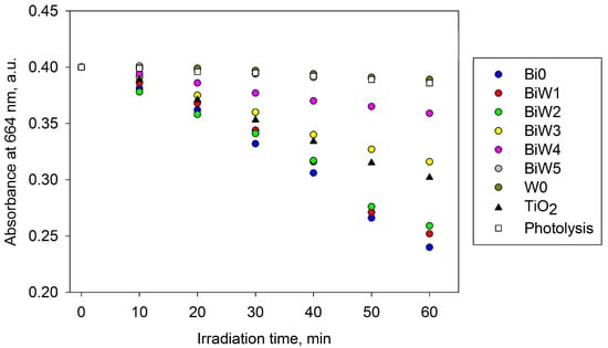 Control experiments in the dark showed no decay in MB absorbance for all types of the coated beads studied. The MB absorbance decay rates for all of the samples, as well as the decay rate for photolysis (experiment with no beads), are given in the Figure 7. From the MB decay rates given it is obvious that the highest photocatalytic activity was observed for the samples Bi0, BiW1, and BiW2. As the bismuth/tungsten ratio increased, the sharp drop in photocatalytic activity can be seen, with the samples BiW5 and W0 showing very low rates of MB degradation, comparable to the photolysis rate. The MB degradation rate for titanium dioxide (sample TiO2) was lower compared to those of the most active Bi/W samples of the array, however, considerable decay still could be seen during the 1 h experiment.
