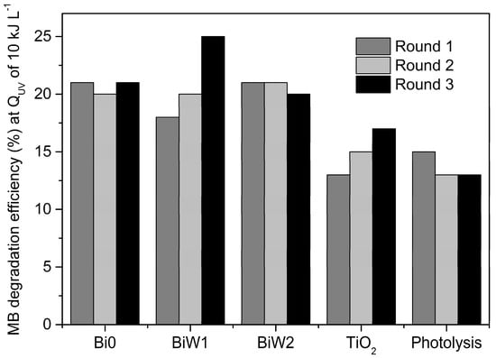Due to the inherent variation of solar irradiance, the results of solar photocatalytic tests were compared when the global solar UV radiation reached 10 kJ L−1 in each round of use (Figure 8). It is noteworthy that the measurement of broadband UV radiation (200–400 nm) is considered the most appropriate spectral range to standardize photocatalytic results [34]. Results presented in the Figure 8 indicate that bismuth oxide beads (Bi0) and bismuth tungstate beads (BiW1 and BiW2) achieved considerably higher degradations of MB as compared to solar photolysis. TiO2 coated beads showed lower activity than Bi0, BiW1, and BiW2 samples. Direct photolysis of MB solution by solar irradiation at neutral pH achieved more than 13% of degradation efficiency with 10 KJ L−1 of accumulated solar UV global irradiation.