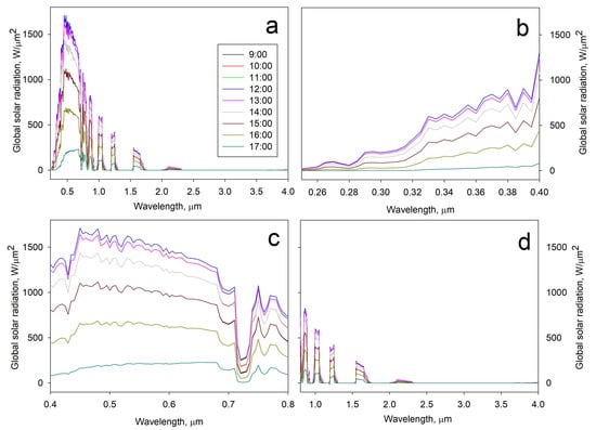Example of the solar spectrum (first round of the experiments): (a) total solar irradiance; (b) the UV component of solar irradiance; (c) the visible component of solar irradiance; and (d) the IR component of solar irradiance.