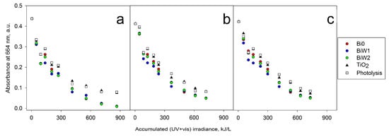 Even though all three rounds of the photocatalytic experiments were performed on sunny days with similar weather conditions for the same total time (180 min), the accumulated global UV radiation varied for each experiment. Therefore, we depicted MB absorbance decay at 664 nm as a function of accumulated global (UV + VIS) irradiance; the graphs for three rounds of the experiments are given in the Figure 10.
