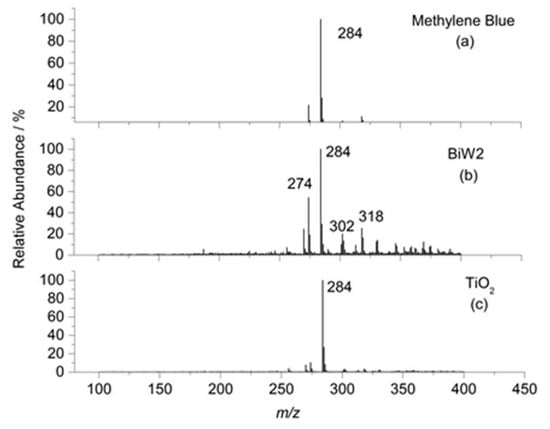 ESI-(+)-MS: (a) methylene blue; (b) fragmentation products of MB photocatalytic degradation in the presence of the sample BiW2; and (c) fragmentation products of MB photocatalytic degradation in the presence of the sample TiO2.