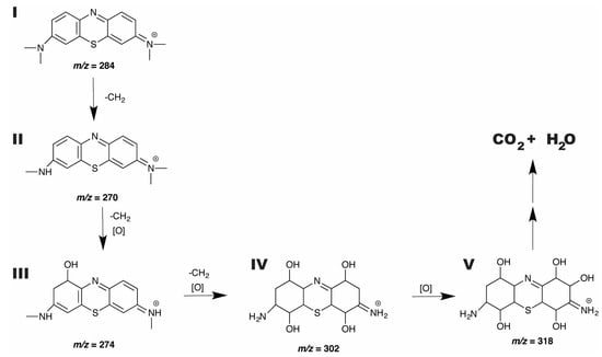 In order to identify the species produced during the methylene blue photocatalytic degradation process, the reaction products from each photocatalyst were monitored by electrospray ionization (ESI-MS). Figure 11 shows the ESI-(+)-MS spectra from the MB standard used to establish the conditions for all analyses (m/z = 284) (Figure 11a) and the products of the MB photocatalytic degradation in the presence of samples BiW2 and TiO2 (Figure 11b,c, respectively). The spectra of the oxidation products show peaks at m/z = 270, 274, 302, and 318. The photocatalytic degradation in the presence of sample BiW2 (Figure 11b) catalyst resulted in a high loss of the m/z = 284 signal intensity, associated with MB oxidation, in correlation with the data observed by absorbance decay. Based on the other peaks observed, a methylene blue degradation pathway has been proposed (Figure 12). Thus, the pathway to the complete mineralization starts with the loss of a methyl group (m/z = 270, compound II). Then, there is the loss of another methylene group, and the appearance of an OH group indicates the beginning of oxidation, thus generating the compound with m/z = 274 (compound III). The complete degradation happens through successive oxidations resulting in the formation of the intermediate products shown as compounds IV and V in Figure 12. From the peaks of the fragmentation products depicted in the Figure 11, it is evident that the MB degradation process was more efficient in the presence of the bismuth tungstate sample, as compared to titanium dioxide.