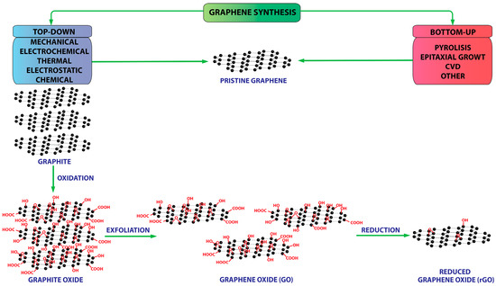 After the first report on graphene, which was obtained manually by mechanical cleavage with a Scotch tape sample of graphite, various techniques developed to produce thin graphitic films have been reported [55,68,69]. These can be divided into two main groups: bottom-up and top-down methods [55,69], as schematized in Figure 1.