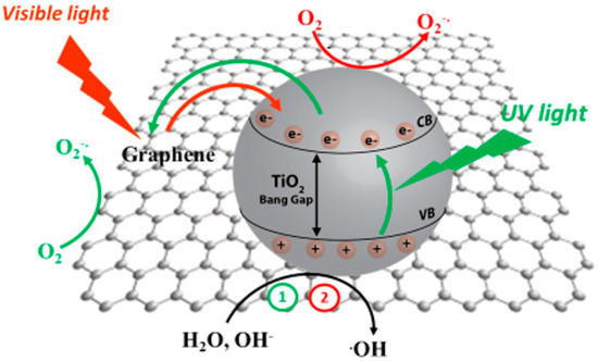- When the operational mechanism takes place via visible light, the electron transfer of thephotogenerated electron is promoted from the G photoexcited state and then delocalized to the TiO2 surface. M.T Silva et al. indicated, by rGO photoluminescence study, that the photogenerated electrons under Vis or NIR laser can be transferred to the surface of TiO2 with a consequent quenching of photoluminescence; also in this case, charge recombination is inhibited with a consequent increasing of photocatalytic activity under visible light [147]. It is important to know that the presence of G in GTiO2Ns photocatalyst produces a red shift in the absorption, reducing its band gap and thus extending the photoresponse to a longer wavelength [148]. The explanation of visible light activation in the GTiO2Ns composites is not clear, but it is possible to attribute this phenomena to the sensitization of TiO2 due to the presence of graphene [147,149,150]. In this case, in the visible light excitation of GTiO2Ns, graphene absorbs the light, and the photoexcited electrons in high energy G states are delocalized into the CB of the TiO2 surface with the dissipation of excess energy due to electron vibrational interaction [151]; successively electrons react with oxygen, resulting in the formation of superoxide radicals. In Figure 3, the activation mechanisms of GTiO2Ns under UV and visible light are reported.