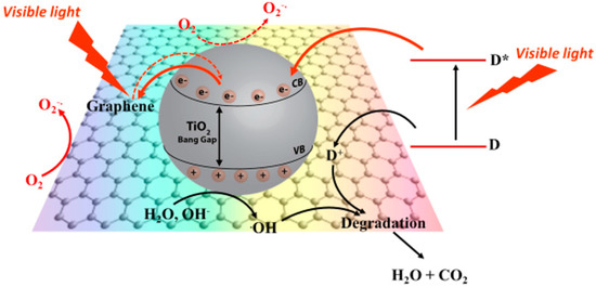 The other possible pathway under visible light involves G which acts as visible light sensitizer promoting the electron transfer to the TiO2 CB (as in 2) [152,153,154] (Figure 4). This process is less probable due to the competition between G and D as light sensitizers, but in any case is possible.