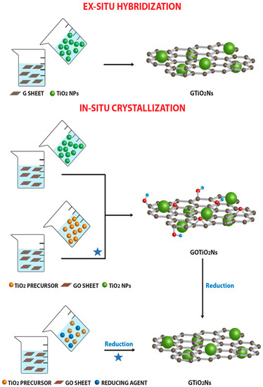 GTiO2Ns can be generally realized in two different ways by “ex situ hybridization” or “in situ crystallization”. In Figure 5, a schematic representation of ex situ hybridization and in situ crystallization in the synthesis of GTiO2NPs is reported.