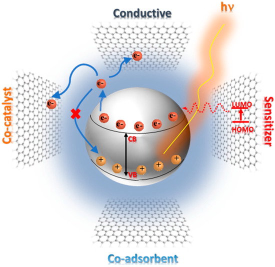 The photocatalytic activity is greatly limited by electron–hole recombination, and therefore several methods are used to increase the efficiency of charge carrier separation and therefore to improve the photocatalytic performance of the SC photocatalyst [139,140,141]. In this context, the combination of graphene with the SC photocatalyst represents an innovative strategy [55,69,142].