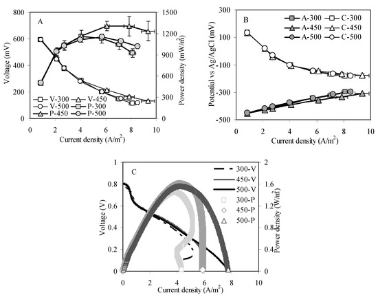 Based on the power curves achieved by the one cycle method at different resistances, maximum power densities of 1160 ± 82 (300 °C) and 1149 ± 11 (500 °C) mW/m2 were obtained, but the reactor with the 450 °C anode was able to generate a power density a little higher of 1305 ± 67 mW/m2 at a current density of 6.1± 0.2 A/m2 (Figure 1A). Figure 1B indicates that the cathode potentials were not obviously correlated with the anode and remained consistent with each other, while the anode potentials changed in a manner similar to the manner in which the power densities of the MFCs changed with different preheating anodes. According to the power density curves achieved via linear sweep voltammetry (LSV), the maximum power densities for the reactors with different anodes were 1450 (300 °C), 1607 (450 °C), 1561 (500 °C) mW/m2 (Figure 1C). The highest power density of the 450 °C reactor using this method was the highest one among all these reactors as well, but the numeric value was 23% higher than the power obtained by the one cycle method. The increasing numeric value for the 500 °C reactor using electrochemical methods was highest (increasing from 1149 to 1561 mW/m2). Watson et al. analyzed power density and power overshoot in MFCs with three polarization methods and proved that maximum power densities obtained by LSV were higher than those obtained using the other two resistance methods []. The scan rate of 1 mV/s may be too quick for the reactor to respond to the voltage change, so the power value was unrealistically high, and a maximum power density of 1305 ± 67 mW/m2 could be considered. Heat treatment on the carbon anode has been shown to improve MFC performance better than other chemical methods [,]; the results obtained in this research confirmed that different heat temperatures have different effects on power generation. Four hundred fifty degrees Celsius is a better treatment temperature than 300 and 500 °C, and temperatures higher than 500 °C (such as 600 °C) may not be suitable for the anode heat treatment of MFCs.