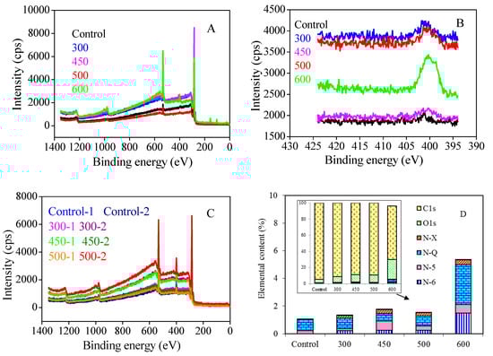 XPS analysis indicated that C, O, and N were the main constituents of the carbon fiber (Figure 2A). Heating at different temperatures changed the element concentration of the carbon fiber. The 600 °C sample had the highest N1s concentrate and the lowest C1s, while the 300 °C sample had the opposite result (Figure 2B). Higher heat temperatures caused more carbon loss, and the relative proportions of N1s and O1s improved. The precursor of the carbon fiber used in the research is polyacrylonitrile (PAN) . Most H and N elements would be lost during the carbonation process to form the carbon fiber. The element concentration is different based on different carbonation conditions at different carbon fiber plants, including carbonization time and temperature. Therefore, during the following treatment on the carbon fiber, the element concentrations and chemical species were likely to be different because the raw materials were different. Even when the same raw materials from the same plant were used, different results might have been obtained because XPS was only able to detect a sample surface with a thickness of about 10 nm, so storage environment and other factors may have caused different XPS results. Some researchers [,] have analyzed the surfaces of other heated carbon fibers and meshes, and, as expected, they had different element concentrations.