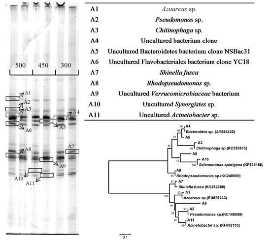 Anode bands were sequenced and are listed in Figure 3. The A1 sequence type represented in the clone library showed 99% identity to Azoarcus sp., which can use nitrate as an electron acceptor to degrade organic compounds []. In some MET-related studies, Azoarcus sp. were found in chocolate wastewater-based MFC anodes []. Alcohol-powered MFCs were the second dominant community members []. The A2 sequence type was 99% similar to uncultured Pseudomonas sp., which have been proven to self-produce phenazine-based mediators in the anodes of MFCs to improve electricity generation []. Furthermore, Pham et al. demonstrated that metabolites produced by Pseudomonas sp. enable Gram-positive bacteria to achieve extracellular electron transfer in acetate-fed MFCs []. The A5 sequence type was 99% similar to an uncultured Bacteroidetes bacterium, and Bacteroidetes were the dominant phyla in the MFCs with granular graphite, granular semicoke, and carbon felt cubes as anodic materials, but not in the granular activated carbon-packed MFCs []. In a wheat straw hydrolysate-fed two-chambered MFC, the bacteria in the biofilm were consortia with sequences similar to those of Bacteroidetes (40% of sequences) []. A8 with sequences 99% was similar to Rhodopseudomonas sp., which are capable of high power production. Rhodopseudomonas palustris DX-1 produced electricity of 2720 ± 60 mW/m2, which was higher than that of mixed cultures in the same device []. Therefore, many microorganisms attached to different anode biofilms were capable of power production or self-produced mediators, but the significant differences in the anode microbial community cannot be found based on this research. The performance difference of these reactors were not obviously correlated with the anode bacteria.