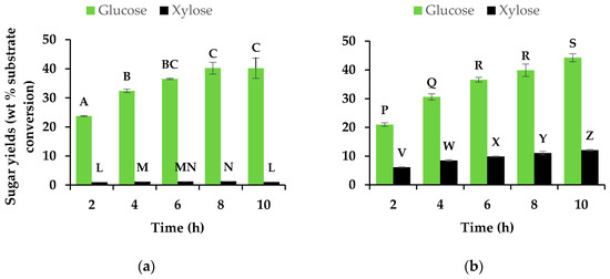 Filter paper and wood pulp were treated with the cellulase cocktail (using the effective loading identified for the respective substrate) for 2–10 h. Fermentable sugars released in the enzyme hydrolysate and the undigested solids generated were assessed. Glucose yields from enzymatic treatment of filter paper ranged from 23.7 ± 0.2 to 42.0 ± 2.2 wt % substrate conversion (Figure 1a). After 6 h of treatment, there was no significant difference in yield (p < 0.05). A reduction in hydrolysis rate over time has been well reported in literature [49,50]. Based on the general understanding of cellulase enzyme kinetics, easily accessible amorphous cellulose is expected to be degraded rapidly during initial stages but hydrolysis rates level off when the residual cellulose becomes recalcitrant [34]. Xylose yield from filter paper was relatively poor and did not exceed 1.3% (Figure 1a). Cotton is almost entirely composed of cellulose (98%) with only a small fraction of hemicelluloses (0.5%) [51].