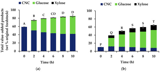 Total value-added products (CNC and sugars, wt % original feedstock) extracted from (a) filter paper and (b) wood pulp, via enzyme-mediated CNC production process. Error bars represent standard deviation of the total value-added products (wt % original feedstock). Bars that are denoted by non-identical letters are significantly different (p < 0.05). Means and standard deviations for CNC yield from filter paper, cellulase cocktail treated for 10 h, were calculated from duplicates.