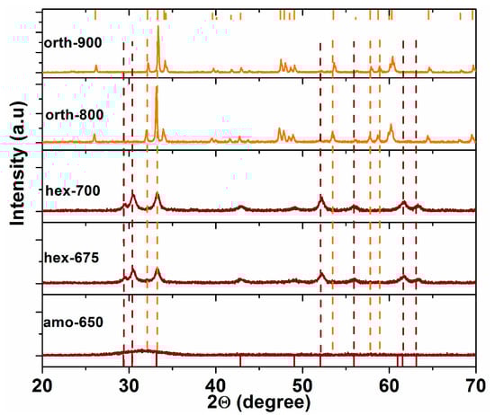 A modified sol-gel route was used to synthesize hexagonal and/or orthorohmbic YFeO3 powders []. In a typical synthesis, Fe(NO3)3·9H2O, Y(NO3)3·6H2O, and citric acid were separately dissolved in deionized water under stirring with 1:1:4 molar ratio. Citric acid was used as a complexing agent to chelate metal cations and prevent precipitation, thus, it was needed in surplus. The obtained brown solution was clear and transparent. From the mixture, the gel was obtained by heating at 300 °C for 2–3 h under magnetic stirring. Subsequently, the solvent was evaporated by combustion in a pyrolysis step at 400 °C for 1 h. The resulting fluffy powder was crushed to fine powder and subsequently calcined at different temperatures for 10 h in air. After calcination and cooling, the obtained samples were characterized and tested in the photocatalytic degradation. They were named as amo-650, hex-675, hex-700, orth-800, and orth-900 according to their phase modifications (amorphous, hexagonal, and orthorhombic) and the calcination temperature (in °C) applied.