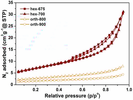 Surface areas were determined from N2 adsorption-desorption isotherms. Classical type IV isotherms with a H3 hysteresis loop were obtained for hex-675 and hex-700, reflecting the presence of a mesoporous material (Figure 2). According to International Union of Pure and Applied Chemistry (IUPAC) reports, this kind of hysteresis is exhibited by non-rigid aggregates of plate-like particles or incomplete pore filling of a network consisting of macropores []. For orth-800 and orth-900, the adsorption was much lower, reflecting low surface area solid material with type Ia isotherms (Figure 2). The applied complex-assisted sol-gel synthesis route and the low calcination temperature of 675 °C lead to a high surface area (24.7 m2/g), exceeding data reported from other studies (11.7 m2 g−1) []. With increasing calcination temperature, the surface area decreases continuously, reaching a value of 5.6 m2/g for YFeO3 calcined at 900 °C (orth-900). This agrees with the increase of the crystallite sizes as estimated from the Scherrer equation. The form of the isotherms indicates that mostly mesoporous interparticle voids are present. Furthermore, the steep increases at very low partial pressures for hex-675 and hex-700 resulting from the filling of micropores with diameters of a of maximum 1 nm might not only result from voids of the 15 nm small crystallites in the hexagonal phase, but might additionally indicate the presence of some structural micropores in the crystallites.