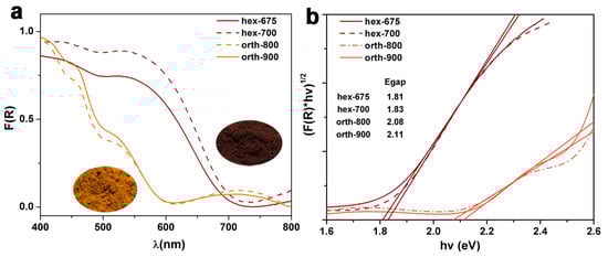 To estimate the optical properties of the YFeO3 synthesized at different calcination temperatures, their visible light absorption spectra were studied by measuring the diffuse reflectance mode and are shown in Figure 3a. YFeO3 with the hexagonal phase (hex-675 and orth-700) clearly exhibits absorption edges closer to 700 nm, enabling the use of a higher fraction of the solar visible light spectrum for photocatalysis.