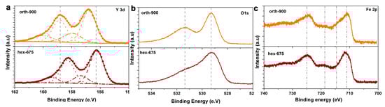 High resolution X-ray photoelectron spectroscopy (XPS) scans of hexagonal and orthorhombic YFeO3. (a) Y 3d; (b) O 1s, and (c) Fe 2p region.