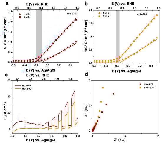Mott-Schottky plots at 1 kHz and 5 kHz of (a) hex-675, (b) orth-900, (c) chopped light photocurrent measurements in 0.1 M Na2SO4/0.1 M Na2SO3 solution (pH = 5.6) under white light emitting diode (LED) illumination, and (d) Nyquist plot of hex-675 and orth-900 in 0.1 M Na2SO4 (pH = 5.6) at 0.1 V vs. Ag/AgCl.