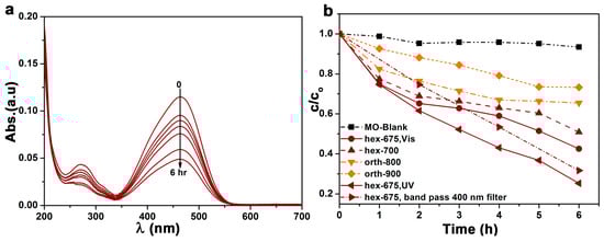 As shown in the absorption spectra of MO in Figure 6a, the MO has two absorption maxima located at 464 nm and at 280 nm; this absorption in the UV probably leads to self-excitation or photolysis. The blank curve in Figure 5b rules out that this ultraviolet (UV) absorption leads to a photochemical self-destruction, since in absence of a photocatalyst, the MO concentration remains practically unchanged.