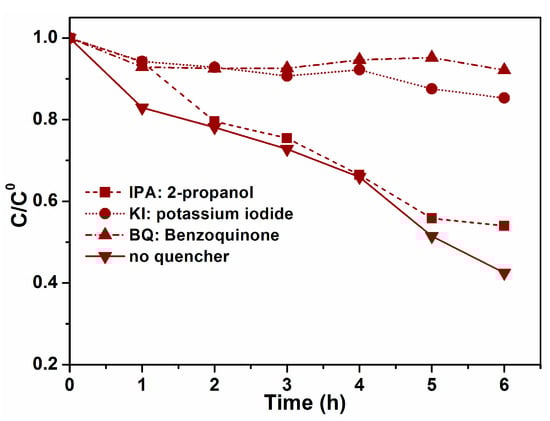 Reactive oxygen species (e.g., ·OH−, ·O2−) are strong oxidizing agents and play a vital role in the photo-assisted degradation of organic contaminants [,]. For the photocatalytic degradation of rhodamine B with YFeO3 under visible light, Chen et al. identified photo-generated holes and hydroxyl radicals as the main active species []. However, since the detailed mechanism of the photocatalytic process can vary for different pollutants, further tests were performed in order to identify the reactive species in case of MO degradation. The conversion of terephthalic acid (TA) to a fluorescence active 2-hydroxy terephthalic acid is used to quantify the formation of ·OH radicals []. In order to check the light induced formation of hydroxyl radicals (·OH), a suspension of an aqueous solution of terephthalic acid and the YFeO3 photocatalysts was irradiated with visible light (λ > 420 nm). The hydroxyl radical formation was determined by measuring the intensity of the fluorescence maximum of 2-hydroxyterephthalic acid at 425 nm []. Very low fluorescence intensity at 426 nm was observed after 4.5 h of irradiation, suggesting slow hydroxyl radical formation (Figure S2). Further tests with different scavenger molecules added to the degradation experiments were performed (Figure 7). Almost no degradation was observed if potassium iodide (10 mM KI) acting as a hole scavenger [] was added to the photocatalytic reaction mixture. This indicates that direct oxidation by the photogenerated holes is involved in the degradation of MO. Since the oxidation power of the holes formed on the YFeO3 surface is high, this mechanism is very likely.