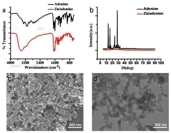 (a) The fourier transform infrared spectroscopy (FTIR) spectra of adenine and Zn/adenine complexes; (b) X-ray diffraction (XRD) patterns of powdery adenine and Zn/adenine complexes; (c) Scanning electron microscopy (SEM) image of Zn/adenine complexes (magnification = 30,000); (d) Transmission electron microscopy (TEM) image of Zn/adenine complexes.