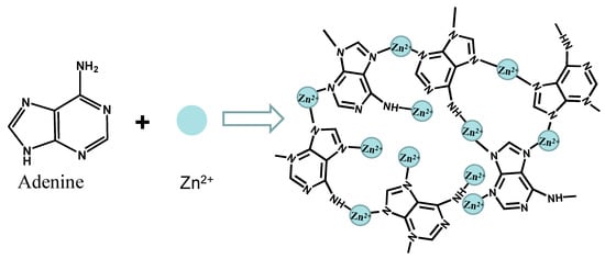 A scheme of Zn2+ reacting with adenine, forming CPs.