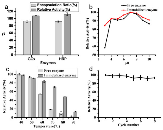 (a) Ratio of encapsulated glucose oxidase (GOx) and horseradish peroxidase (HRP) by the Zn/adenine complexes, and the relative activity of the two immobilized enzymes compared to the free enzymes; stability of the GOx–Zn/adenine complexes compared with the equivalent free enzymes (b) at different pH values at 25 °C; (c) at different temperatures; (d) relative activity of GOx–Zn/adenine complexes after reusing for 8 cycles.