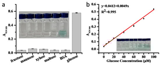 After establishing the feasibility of using the Zn/adenine complexes for single-enzyme immobilization, co-immobilization of multiple enzymes was further performed. Co-immobilization of multiple enzymes could enhance the overall reaction efficiency and specificity, and omit the isolation of reaction intermediates [10]. GOx specifically converts glucose to gluconic acid and produces H2O2 as a byproduct, which is a co-substrate for HRP to oxidize 2,2′-azinobis(3-ethylbenzothiazoline-6-sulfonic acid) diammonium salt (ABTS) [52]. Therefore, based on the above studies, GOx and HRP were chosen for a cascade reaction. The total immobilization ratio was over 90%, measured by the Bradford assay. The catalytic activities of the co-localized GOx and HRP in the Zn/adenine complexes were evaluated by reacting with glucose using ABTS as a chromogenic substrate, and they were compared with the same concentration of free GOx and HRP. However, the relative activity of single enzymes on their own was just half of the activity of the co-immobilized enzymes. The selectivity for glucose was confirmed by monitoring the absorbance at 414 nm in the presence of various competing compounds (Figure 5a). Different concentrations of glucose were used to measure the sensitivity of the sensor. Figure 5b illustrates a good linearity between the absorbance and the concentration of glucose in the range of 0–100 µM (R2 = 0.995). The concentration of limit of detection CLOD can be expressed as a function of S (slope of the curve) and SB (a standard deviation): CLOD = 3SB/S [35]. In the experiment, SB was determined to be calculated by three sets of blank signals, and S was 0.0049. Calculated according to the formula, the limit of detection (LOD) was determined to be 1.84 μM, which is lower than some of the previously reported colorimetric glucose sensors [35,53].