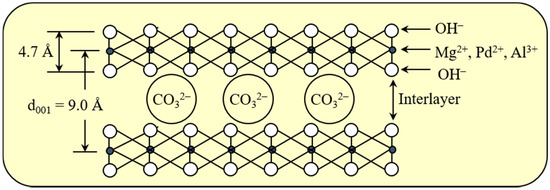 Figure 1 shows a structural model of the Pd0.016Mg3Al(OH)16CO3∙xH2O hydrotalcite used in this study. Hydrotalcite is a kind of anion clay with the general formula [M2+1−mM3+m (OH)2]m+An−m/n·xH2O (M2+, M3+ = metal cations, An− = interlayer anion) [22]. The metal cations are distributed in brucite-like layers, and the interlayer anions are fixed between the brucite-like layers by electric charge interaction. The M2+ cation is usually Mg2+ and the M3+ cation is usually Al3+. The noble metal Pd2+ cation can be introduced into the M2+ position when Pd2+/(M2+ + M3+) < 5 mol % [23,24,25]. Basic MgAl-type hydrotalcite is the most common hydrotalcite, and has been used as an effective catalyst for some industrially important reactions [22,23,24,25,26,27,28,29].