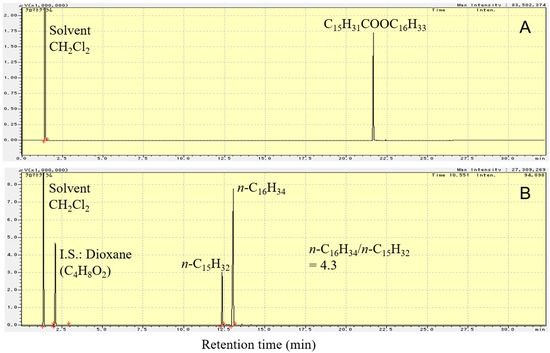 Figure 5 shows the flame ionization detector–gas chromatography (FID-GC) charts of C15H31COOC16H33 and the liquid product formed upon deoxygenation of C15H31COOC16H33 in H2 atmosphere, at 300 °C, for 2 h, over 1 wt.% Pd/Mg(Al)O catalyst. As shown in Figure 5B, the reactant (C15H31COOC16H33) peak is not observed in the GC chart after reaction at 300 °C for 2 h. The liquid products were almost saturated hydrocarbons n-C16H34 and n-C15H32. By calculating the amount of each component in the product using the GC chart, the molar ratio of n-C16H34 to n-C15H32 in the liquid product was found to be 4.3.