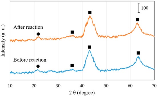 Figure 6 shows X-ray diffraction (XRD) patterns of 1 wt.% Pd/Mg(Al)O catalyst before reaction and after reaction (for deoxygenation of C15H31COOC16H33 in H2 atmosphere at 300 °C for 2 h). The sample before reaction was obtained by calcining Pd0.016Mg3Al(OH)16CO3∙xH2O in air at 450 °C for 3 h, and then reducing in H2 at 300 °C for 1 h. The XRD pattern of the sample before reaction proved the formation of mixed Mg-Al oxides phases, indicating that the decomposition of the layered structure occurred after calcination and reduction. The reflections in XRD pattern at about 43° and 63° corresponded to MgO-like phase (periclase), or rather MgO-Al2O3 solid solution Mg(Al)O [22]. The reflection of Al2O3 phase at 23° was very small, indicating that Al3+ cations were dispersed in the structure of MgO without the formation of spinel species. Because the Pd loading was low (1 wt.%) in the Pd/Mg(Al)O catalyst, the metal Pd crystals certainly formed in very small sizes, and thus the metal Pd phase could not be detected in the XRD pattern. The sample after reaction was obtained by filtrating out liquid products, and then drying in vacuum at room temperature for 10 h. From a comparison of the XRD pattern of Pd/Mg(Al)O catalyst before reaction, no obvious change could be observed in the XRD patterns of Pd/Mg(Al)O catalyst after reaction in H2 atmosphere at 300 °C for 2 h.