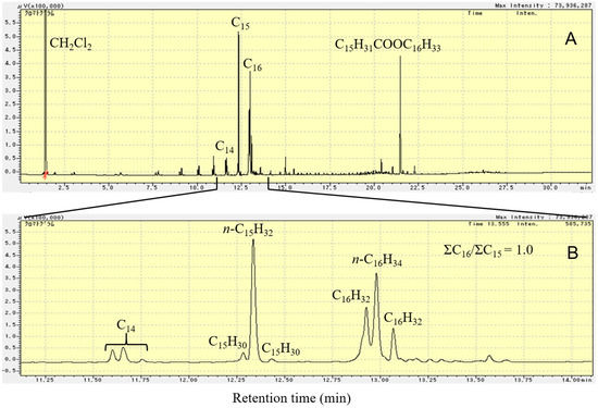 The FID-GC charts of the liquid product formed by deoxygenation of C15H31COOC16H33 in N2 atmosphere at 300 °C for 2 h over 1 wt.% Pd/Mg(Al)O catalyst. (A): retention time from 0 to 32 min, (B): retention time from 11.1 to 14.1 min. Reaction conditions: C15H31COOC16H33: 5 g; catalyst: 0.2 g; N2 pressure at 25 °C: 0.9 MPa.