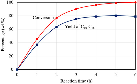 The dependence of C15H31COOC16H33 conversion and C10–C16 hydrocarbons yield on reaction time for the catalytic deoxygenation of C15H31COOC16H33 in N2 atmosphere, at 300 °C, over the 1 wt.% Pd/Mg(Al)O catalyst. Reaction conditions: C15H31COOC16H33: 5 g; catalyst: 0.2 g; N2 pressure at 25 °C: 0.9 MPa.