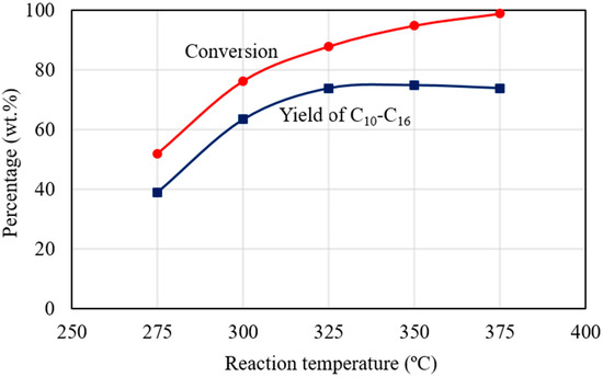 Figure 10 shows the dependence of C15H31COOC16H33 conversion and C10–C16 hydrocarbon yield on reaction temperature for the catalytic deoxygenation of C15H31COOC16H33 in N2 atmosphere, for 2 h, over the 1 wt.% Pd/Mg(Al)O catalyst. C15H31COOC16H33 conversion increased with an increasing reaction temperature from 275 to 375 °C, and achieved a conversion of over 99% for the reaction at 375 °C for 2 h. The yield of C10‒C16 hydrocarbons increased with an increasing reaction temperature from 275 to 325 °C. At a reaction temperature higher than 325 °C, the yield of C10‒C16 hydrocarbons could not be improved by increasing the reaction temperature because the number of light hydrocarbons (<C9) in the product increased at high reaction temperatures.