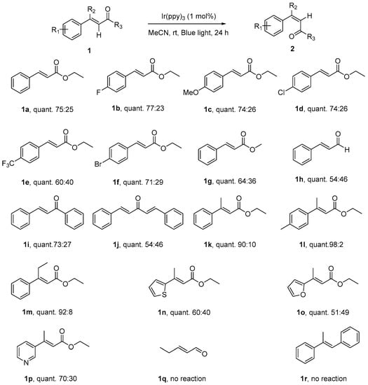 With the optimized reaction conditions in hand, we continued to examine the scope of E-olefins applicable in such transformation (Scheme 2). Various (E)-ethyl cinnamates—with electron-donating, electron-withdrawing, and neutral substituents at the para-position of benzene ring—could proceed effectively to give the isomerization product (Z)-isomers with modest of selectivity (1a–1g). The electronic properties of these substituents did not show apparent effects on the selectivity of this transformation, the Z/E selectivity of these reactions fell in the range from 60:40 to 75:25. Under the reaction condition, the substituents, such as F-, MeO-, Cl-, CF3-, and Br-, were well tolerated, there were no other byproducts could be detected along with the two isomers of the alkene, which made this reaction clean and practically very easy for workup. In addition, when (E)-cinnamyl aldehyde, (E)-α,β-unsaturated ketones were subjected to the reaction conditions, the corresponding Z-isomers were obtained with similar selectivity (1h–1j).