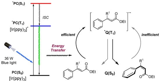 From the results of our work, it is clearly demonstrated that organo-photoredox catalyst—such as fac-Ir(ppy)3—can facilitate the energy transfer from visible light to the cinnamates system for the activation of the double bond. A plausible pathway was thus proposed, based on the literature precedents [18,30] and experimental data (Scheme 3). Absorbing a photon, the photocatalyst PC(S0) in its singlet ground state is excited to the first singlet excited state *PC(S1), which relaxes to the lowest energy triplet excited state *PC(T1) via successive fast intersystem crossing (ISC) (spin–orbital coupling) and internal conversion (vibrational relaxation). Since the transition of the triplet excited state to the singlet ground state is spin forbidden, the triplet excited state *PC(T1) is reasonably long lived. In photocatalysis, the photo-excited catalyst can be quenched by the substrates via outer-sphere single electron transfer (SET) or energy transfer (ET) processes, leading to productive transformation. It is difficult to completely exclude a single electron transfer (SET) pathway in our visible-light photocatalytic E-to-Z isomerization, However, this pathway was ruled out as the addition of a sacrificial reductant (e.g., trimethylamine, N,N-Diisopropylethylamine), the classical strategy to promote photoredox reaction [8,31], did not facilitate this transformation. Thus, we tentatively proposed that an energy transfer process occurs between the photo-excited triplet state *PC(T1) and the accessible low energy triplet state of cinnamates substrate in this isomerization. The triplet–triplet energy transfer regenerates the ground state of the photocatalyst and results in the substrate of an excited triplet state to engage in the photochemical isomerization reactions.
