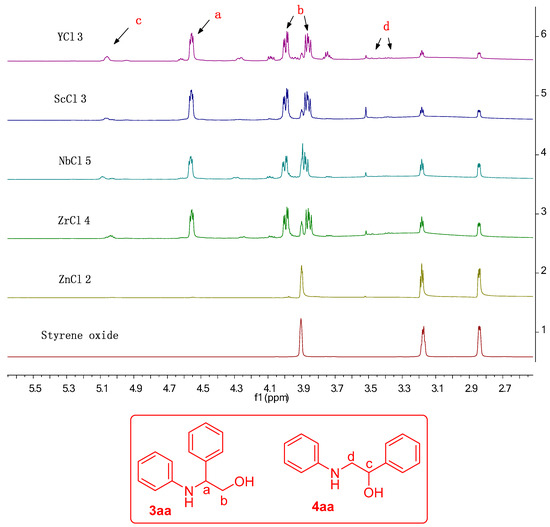 We also compared the catalytic activity of four transition metal-based Lewis acid catalysts NbCl5, ZrCl4, ZnCl2, and Nb(OEt)5 (Table 1, entries 10–13). When used under solvent-free conditions at room temperature, 1 mol % NbCl5, Nb(OEt)5, and ZrCl4 gave conversions of 82%, 85%, and 75%, respectively, after a 1 h reaction time with a decrease in regioselectivity when compared to tested rare-earth based catalysts. The change in counter anion in the case of Nb(OEt)5 did not result in any considerable change or enhancement in catalytic activity towards aminolysis. Moreover, to our surprise, ZnCl2 gave almost no conversion under identical reaction conditions, even when reaction time was prolonged to 5 h. Figure 1 shows the proton nuclear magnetic resonance (1H-NMR) spectra for the aminolysis reaction of 1a with 2a for all tested catalysts under identical reaction conditions. Comparatively, YCl3 as a catalyst seemed to be the best choice amongst the tested series of catalysts considering the higher conversion of epoxide and higher regioselectivity (Figure 1 and Table 1).