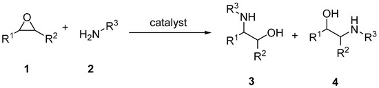 The simplest approach to the β-amino alcohols is the ring opening of epoxides with amines (Scheme 1) [7]. This approach is usually met with some limitations such as kinetically slow reactions that may be due to inefficient activation of epoxides and low regioselectivity. To overcome these issues, many new catalytic methods have been introduced using various catalysts, with aims to enhance the electrophilicity of epoxides through metallic coordination or H-bonding [8,9,10,11,12,13,14,15,16,17,18,19,20,21,22,23,24,25,26]. The N-alkylation of amines using cyclic carbonates is also an attractive approach to molecules under discussion [27,28]. Many methods for the synthesis of β-amino alcohols from epoxides or cyclic carbonates require a high reaction temperature, dry reaction conditions, and high catalyst loadings. The preparation of β-amino alcohols under solvent-free conditions and at room temperature is desirable and important due to environmental considerations.