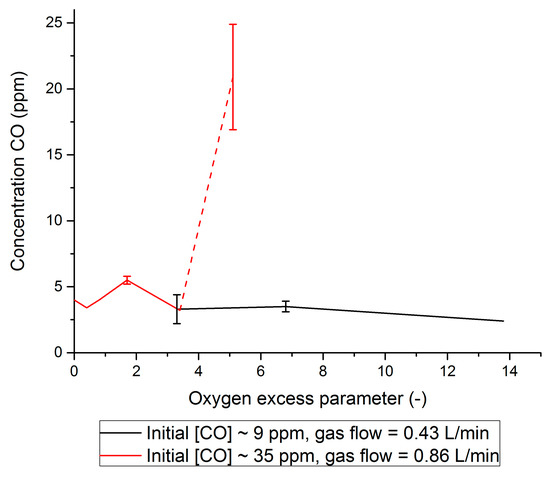 Next, CO removal from H2 + CO2 gas streams by PROX was tested using a commercially available Pt/Al2O3 catalyst placed downstream from the FA dehydrogenation reactor. The PROX catalyst was not heated. A controlled amount of O2 (in air) was injected into the gas stream before the PROX catalyst. The considered parameters were the CO concentration in the gas stream and the amount of added O2. A combination of these numbers can be expressed through the O2 excess parameter (Equation (7)), representing the O2 excess, relatively to its amount required for total CO oxidation. At , the O2 concentration in a gas mixture is exactly enough to convert all CO (catalyst selectivity ~ 100%)