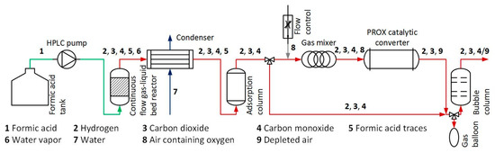 FA was dehydrogenated in a 1 L continuous-flow gas–liquid bed reactor (Figure 5). A cylindrical, non-stirred reactor vessel of a 7.0 cm inner diameter and 40 cm length was heated by means of an internal heating element connecting to an oil circulator (Huber Pilot One). The temperature inside the reactor was varied in the range of 60–80 °C. FA was injected into the reactor (0.3–0.9 mL/min) at the reactor bottom through a HPLC pump (HPLC Pump 422, Kontron Instruments, Montigny Le Bretonneux, France). The gas bubbles produced due to the reaction rose, mixing the reaction solution. Outside the reactor, a H2 + CO2 gas mixture was passed through a condenser and an adsorber (activated carbon) to remove FA and water vapors. The total gas flow was measured using a bubble flowmeter. In separate experiments, a H2 + CO2 gas mixture was passed through a container of 2.8 cm inner diameter, containing a PROX catalyst (50 g). A commercial 0.5 wt % Pt supported on alumina (spheres of 1.8–3.5 mm diameter, Johnson Matthey, Royston, UK) was used as a PROX catalyst. An air flow controlled by a mass flow controller was injected into the gas stream before the PROX catalyst.