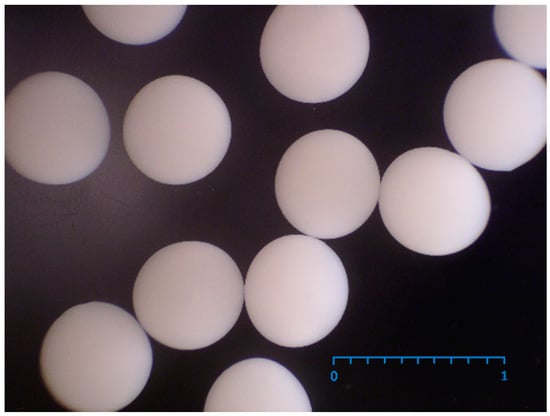 Photomicrography of uniform polyelectrolyte complex (PEC) beads with entrapped recombinant E. coli (Escherichia coli) cells with overexpressed cyklohexanone monooxygenase (CHMO). The immobilization yield was 100%. The scale bar is 1 mm.