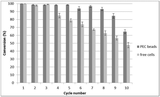 The high viability of cells immobilized in PEC beads was identical with that of free cells prior to biotransformations. This demonstrates the excellent biocompatibility of the novel PEC beads and their ability to preserve the physiological microenvironment for immobilized cells. At the same time, the nontoxicity of the PEC complex with CS in capsules [22] was also confirmed in the PEC beads developed in the present work. In addition, the high cell viability which did not vary after 10 biotransformation cycles demonstrates the preservation of the physiological conditions for immobilized cells during biotransformations.