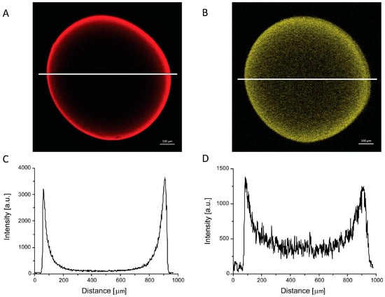 To investigate the morphology of the PEC beads, the confocal laser scanning microscopy arrangement described in the previous section was used (Figure 3). The beads contained Rhodamine 123 and Eosin Y as fluorescent tracer dyes of a concentration of 10−6 mol/L and were incubated for 15−30 min. These two non-covalently bound fluorescent tracer dyes were employed to monitor the distribution of the residual opposite charge within the PEC microcapsule [21]. Anionic Eosin Y (Figure 3A) was predominantly localised in the outer region of the PEC bead, and its concentration dropped sharply towards the bead interior. On the other hand, cationic Rhodamine 123 (Figure 3B) was observed in the entire volume of the PEC bead, with a higher intensity at the outer region and a lower intensity in the centre. Unlike in the previous study on polyelectrolyte capsules [21], no specific layers or internal structures were observed in the present study. It is worth noting that the spatial distribution of the fluorescence reflects the concentration of the dye molecules, corresponding to the residual free-charged groups of the matrix, rather than the spatial distribution of polymer components in the bead.